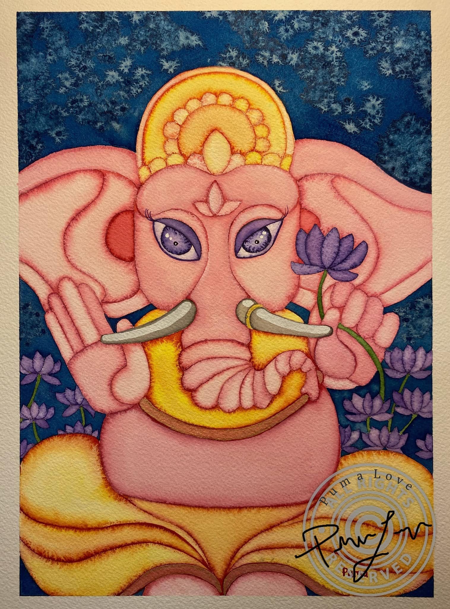 This original watercolor painting depicts Lord Ganesha, remover of obstacles. Pink Ganesha symbolizes love, affection, and compassion. The purple lotus symbolizes self-awakening, harmony, and balance within oneself.